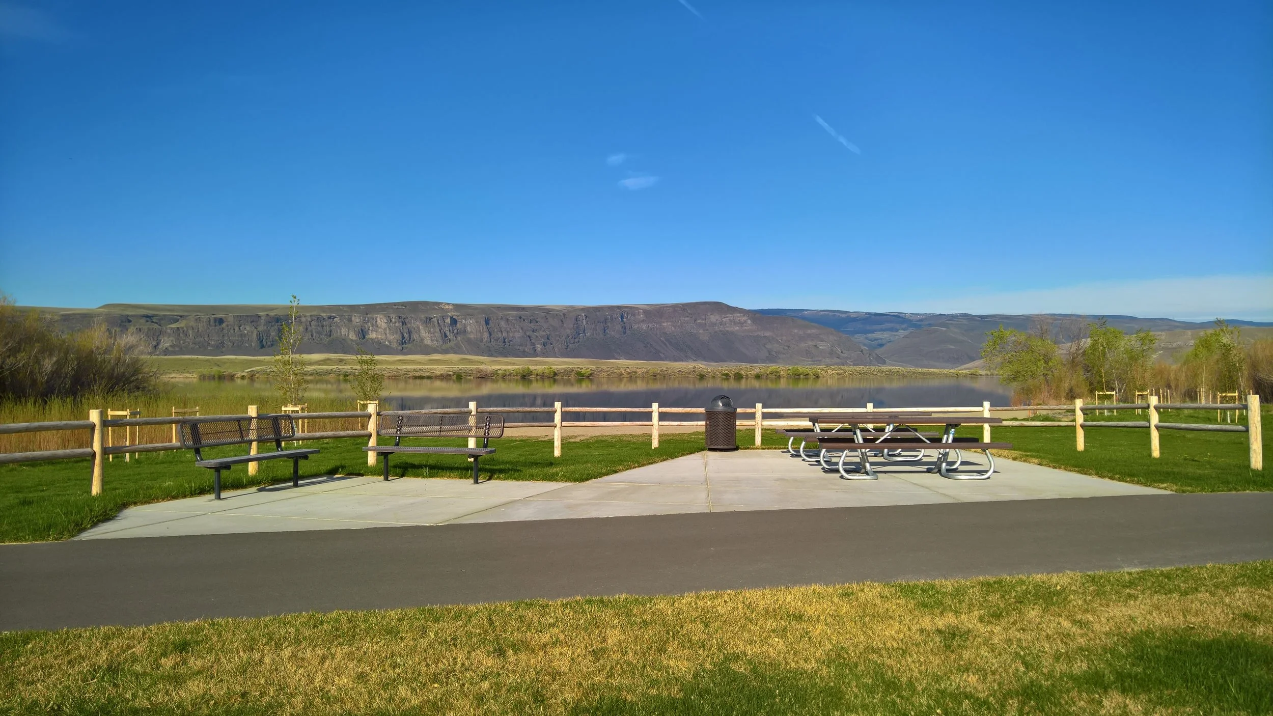 Covered area at the west end of Chinook beach. Each of the day-use areas in Chinook and River Bend parks have have a covered areas so you can grab some shade.